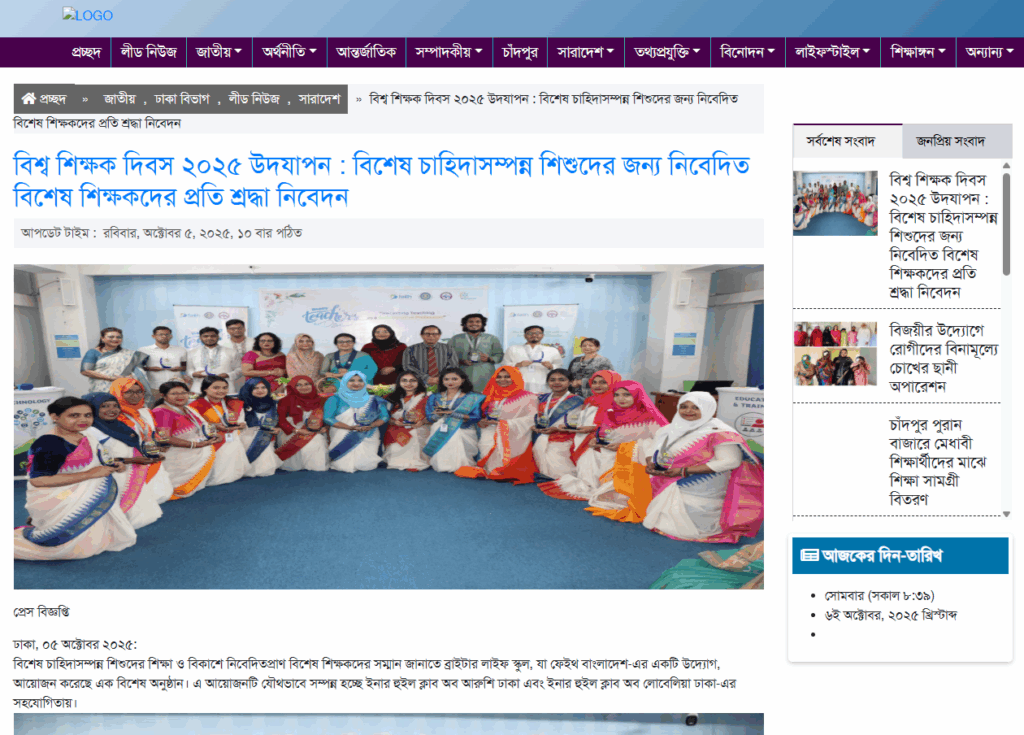 বিশ্ব শিক্ষক দিবস ২০২৫ উপলক্ষে বিশেষ শিক্ষকদের সম্মাননা প্রদান ও সহযোগিতামূলক শিক্ষার মূল্যবোধ প্রচার।