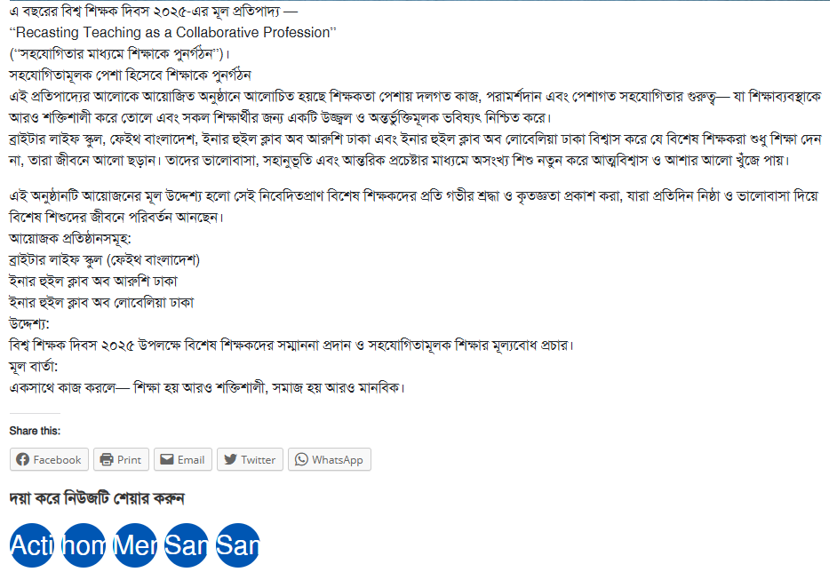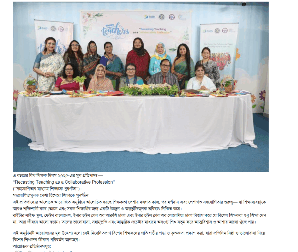 ব্রাইটার লাইফ স্কুল, ফেইথ বাংলাদেশ, ইনার হুইল ক্লাব অব আরুশি ঢাকা এবং ইনার হুইল ক্লাব অব লোবেলিয়া ঢাকা বিশ্বাস করে যে বিশেষ শিক্ষকরা শুধু শিক্ষা দেন না, তারা জীবনে আলো ছড়ান। তাদের ভালোবাসা, সহানুভূতি এবং আন্তরিক প্রচেষ্টার মাধ্যমে অসংখ্য শিশু নতুন করে আত্মবিশ্বাস ও আশার আলো খুঁজে পায়।