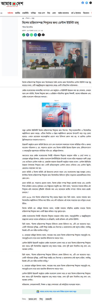 বিশেষ চাহিদাসম্পন্ন শিশুদের জন্য বিশেষভাবে তৈরি দেশের প্রথম বিশেষায়িত ডেন্টাল ইউনিট যাত্রা শুরু করেছে ঢাকায়, যেটি অন্তর্ভুক্তিমূলক স্বাস্থ্যসেবার ক্ষেত্রে একটি ঐতিহাসিক মাইলফলক।