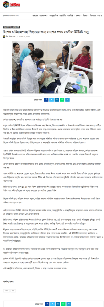 রাজধানী ঢাকায় যাত্রা শুরু করেছে বিশেষ চাহিদাসম্পন্ন শিশুদের জন্য বিশেষভাবে তৈরি দেশের প্রথম বিশেষায়িত ডেন্টাল ইউনিট। যেটি অন্তর্ভুক্তিমূলক স্বাস্থ্যসেবার ক্ষেত্রে একটি ঐতিহাসিক মাইলফলক।