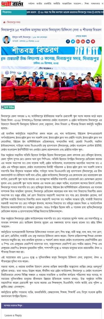 দিনাজপুর জেলা সদরের ৬ নং আউলিয়াপুর ইউনিয়নের অন্তর্গত চেরাডাঙ্গী স্কুল অ্যান্ড কলেজ মাঠে মহান বিজয় দিবস -২০২৫ উপলক্ষে১৬ ডিসেম্বর মঙ্গলবার ফেইথ বাংলাদেশ ও ব্রেইন ফাউন্ডেশন দিনাজপুর এর উদ্যোগে দিনব্যাপী বিনামূল্যে চিকিৎসা সেবা, চক্ষুসেবা, ঔষধ বিতরণ ও শীতবস্ত্র বিতরণ কর্মসূচি অনুষ্ঠিত হয়েছে।
